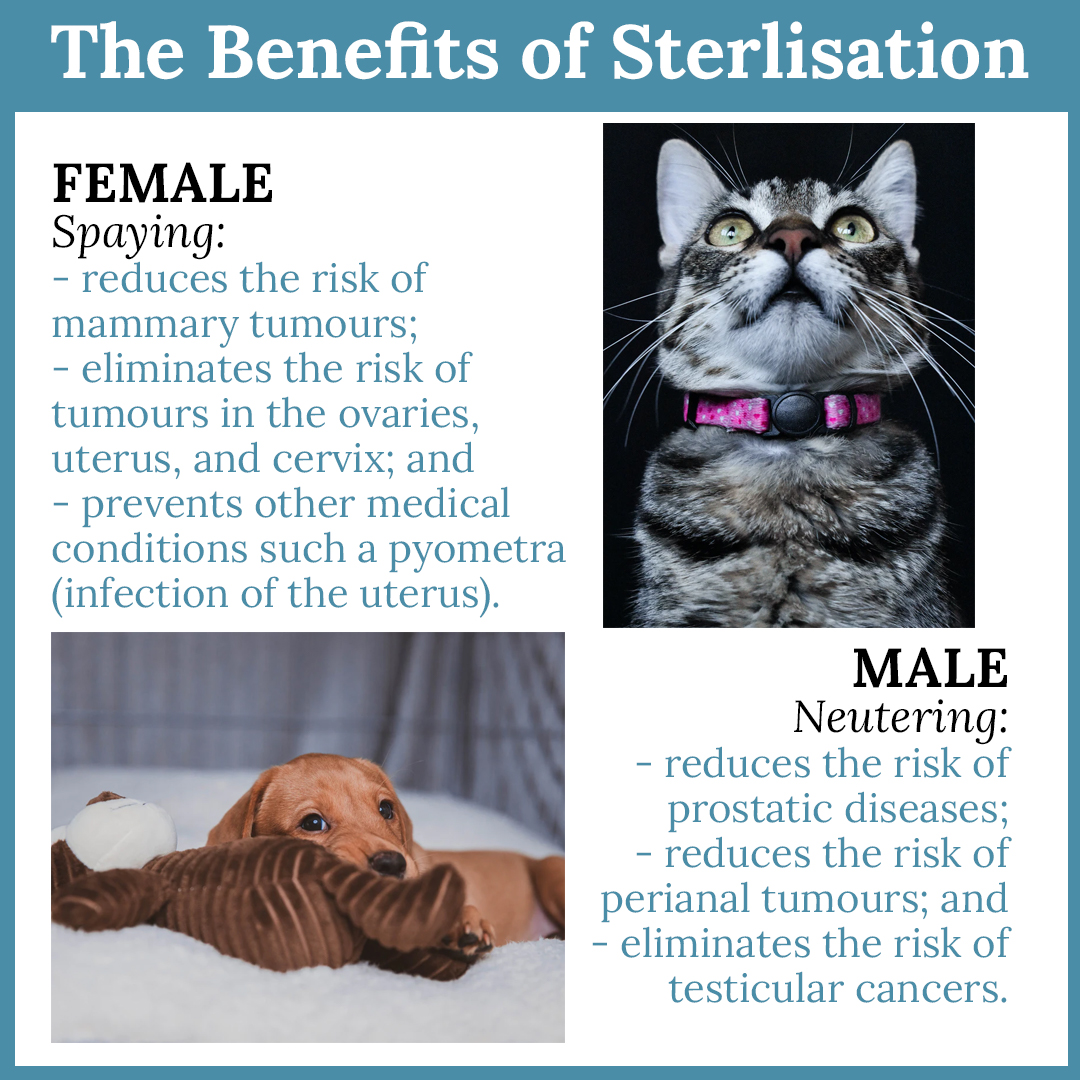 This article will focus on the benefit of sterilisation (spaying and neutering). Did you know spaying and neutering is not only to prevent unwanted litters? There are many health and behavioural benefits to doing this.